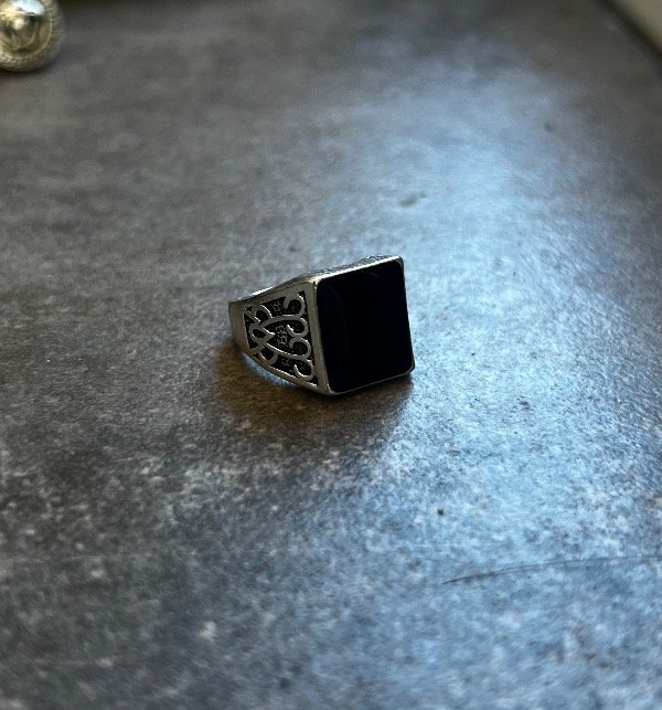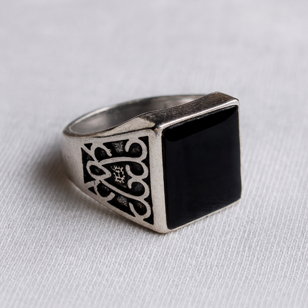 Su piedra negra rectangular se impone con un aura de misterio y poder, enmarcada por un cuerpo trabajado en aleación metálica con detalles clásicos en sus laterales. El contraste entre la superficie pulida y el grabado ornamental crea un equilibrio entre modernidad y herencia.