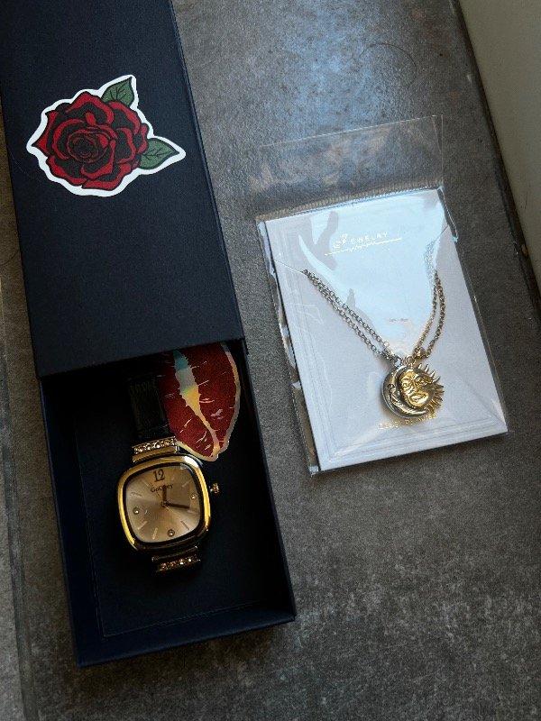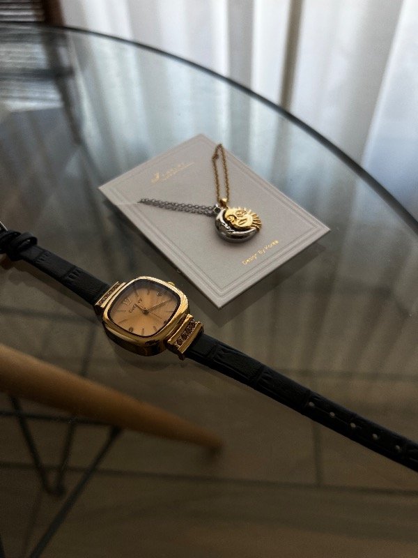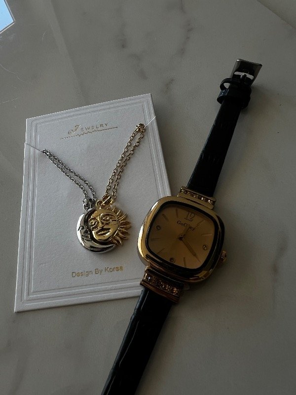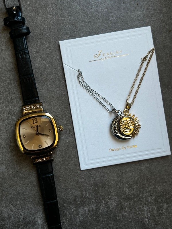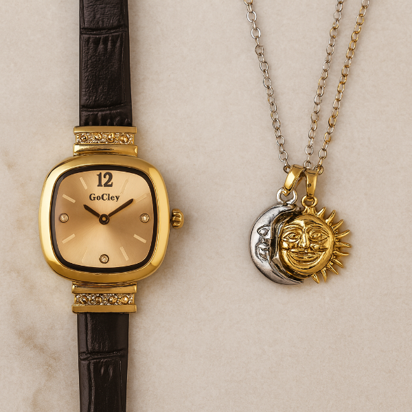 El Aurora Set combina la precisión de un reloj de acero con la delicadeza de un collar con dije imantado inspirado en el sol y la luna, símbolo de la unión eterna.